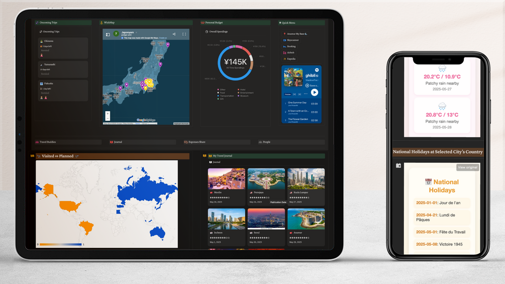 - A Notion integration & Webhook runs on background and checks the 3-days weather forecast and national holidays for selected cityβs country